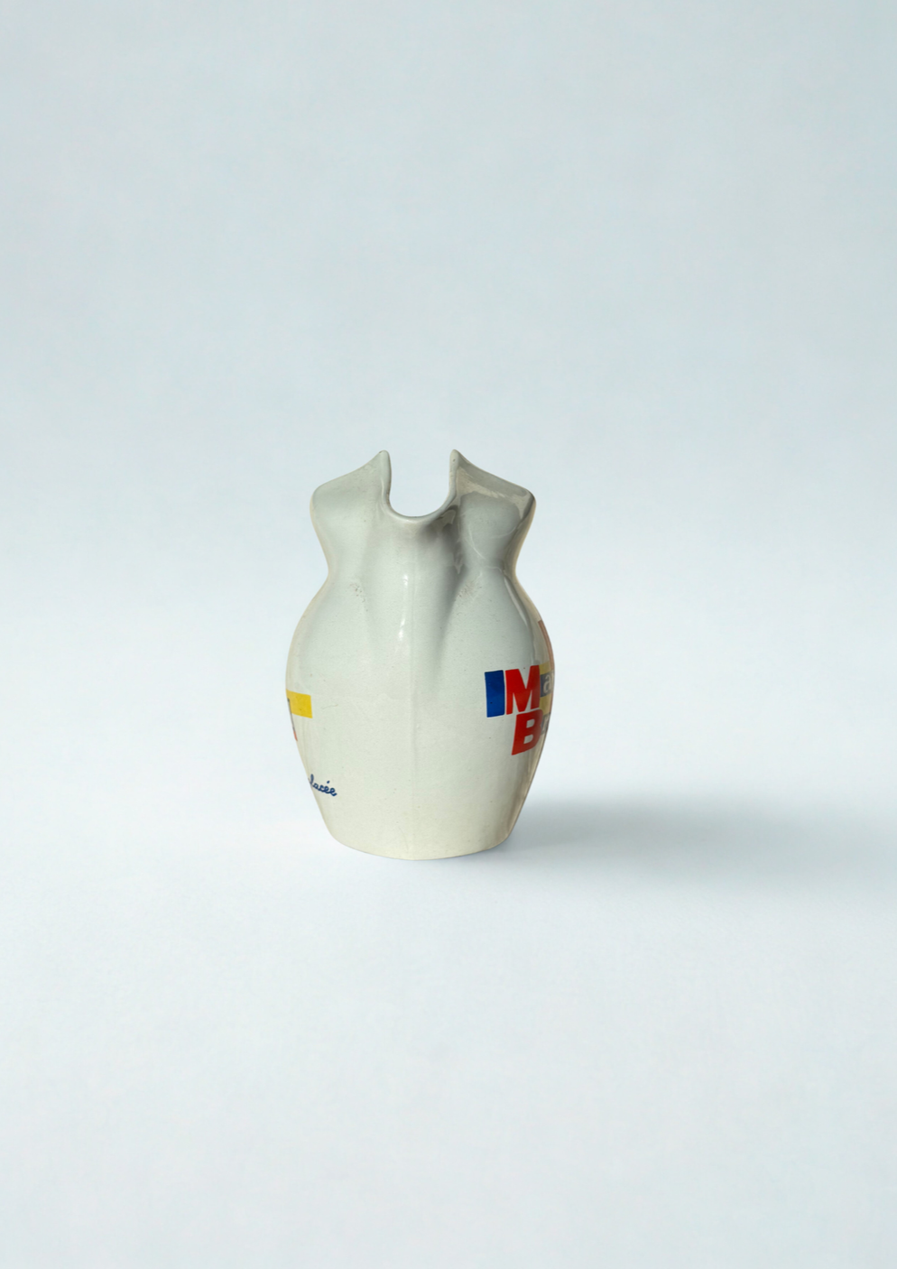 Original French advertising carafe produced for the liquor brand Marie Brizard. Made of glazed ceramic with integrated handle and spout, featuring its original label with primary colors. A true example of post-war French graphic advertising design. These carafes were produced exclusively for French bars and bistros and were never sold to the public, used solely for serving the brand’s product.