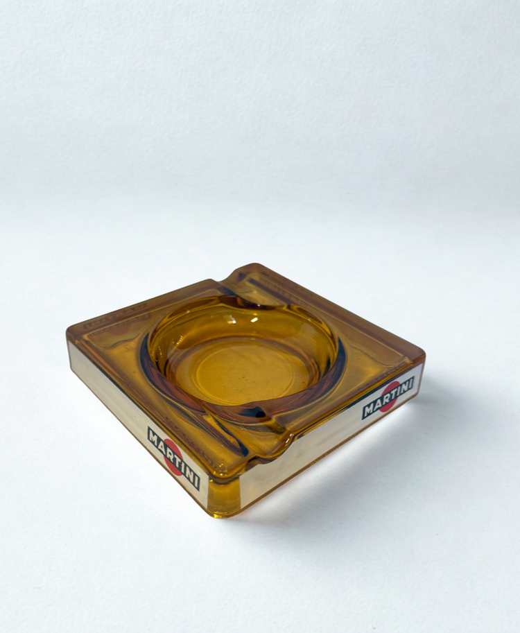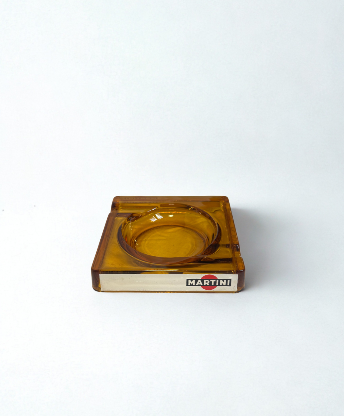 Original French advertising ashtray produced for the liquor brand Martini. Made of dark amber glass with around shape shape, featuring its original logo labeled around it in bold lettering.