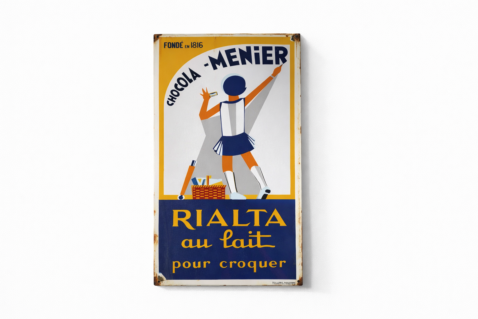 Authentic looking French enamel advertising sign produced for Chocolat Menier, featuring the iconic Rialta au lait design from the late Art Deco period. This model is distinguished by its bold graphic composition, flat color fields, and dynamic figure, emblematic of French commercial art between the wars.
