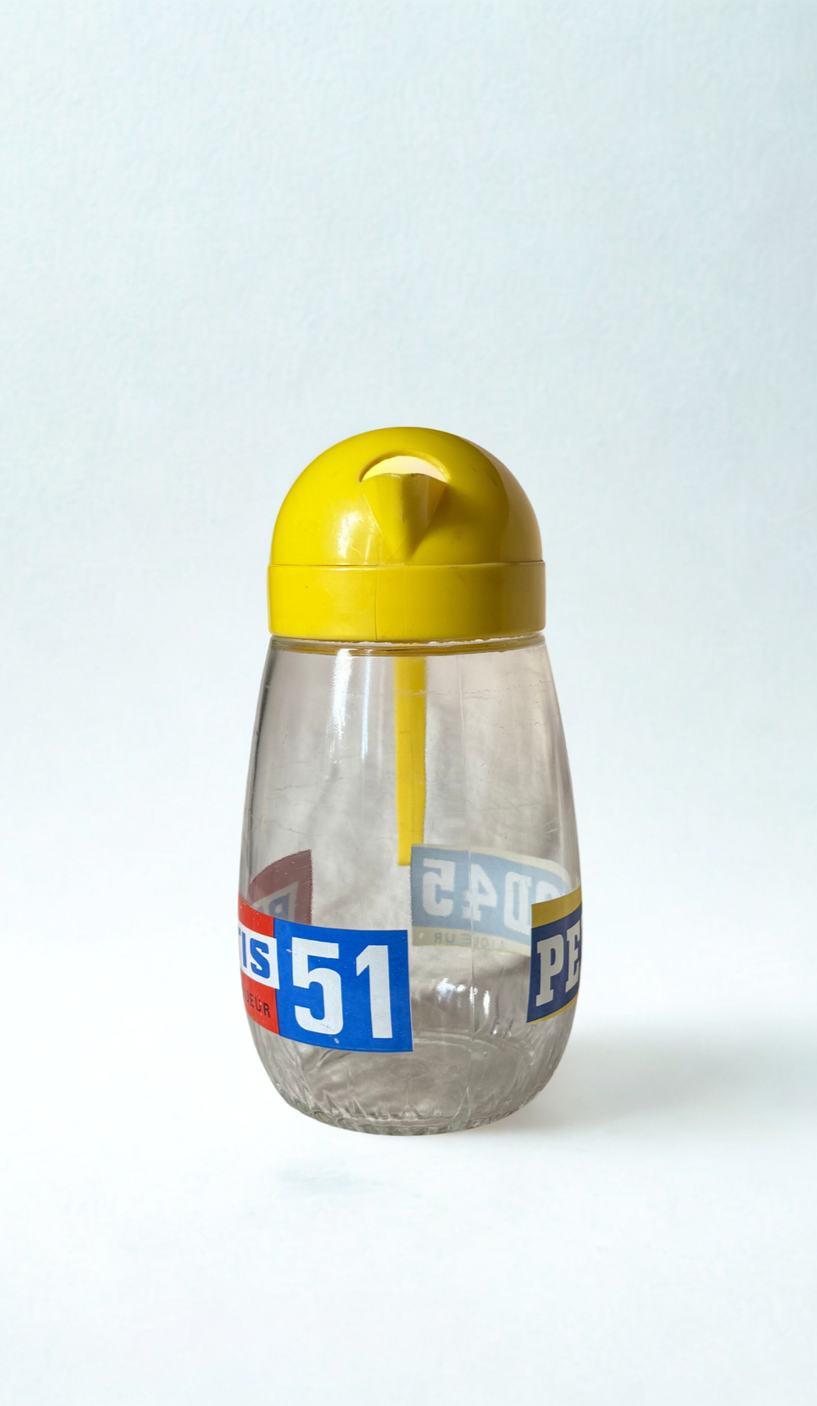 Original French advertising carafe produced for the liquor brand Pernod and promoting Pastis 51. Made of pressed glass with a ribbed base and yellow plastic pourer, featuring its original label Pernod 45.
