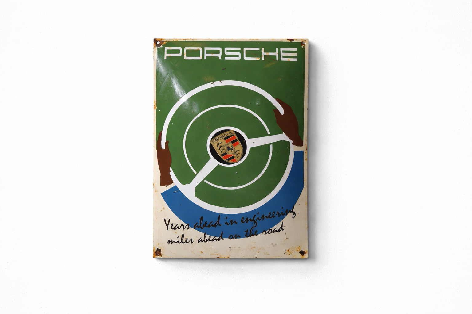 Original looking steel advertising sign produced for European Porsche dealerships and authorized workshops at the end of the 1950s. Featuring the period slogan “Years ahead in engineering, miles ahead on the road,” this piece reflects Porsche’s early positioning as a brand defined by technical rigor.