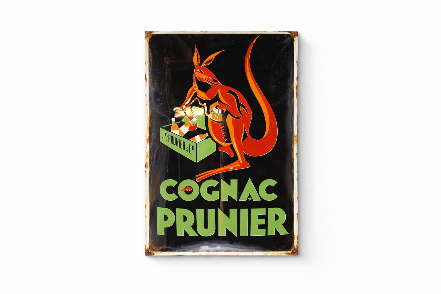 Prunier was among the cognac producers who understood early that international markets required strong visual identity. This sign belongs to that tradition: bold color, instantly recognizable imagery, and a playful but strategic symbol designed to stand out from distance.