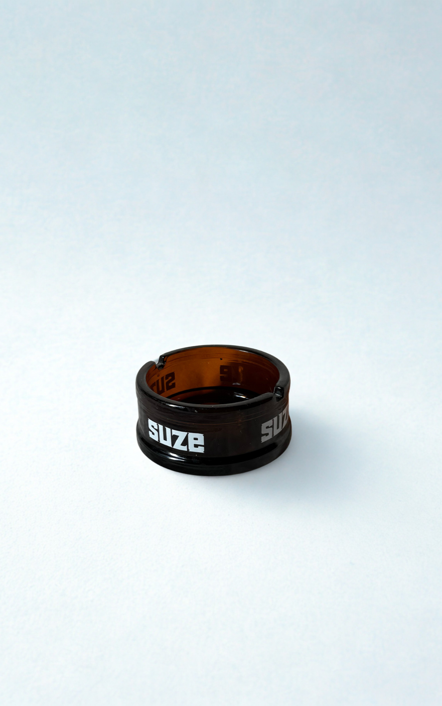 Original French advertising ashtray produced for the liquor brand Suze. Made of dark amber glass with a round shape, featuring its original logo labeled around it in bold lettering.